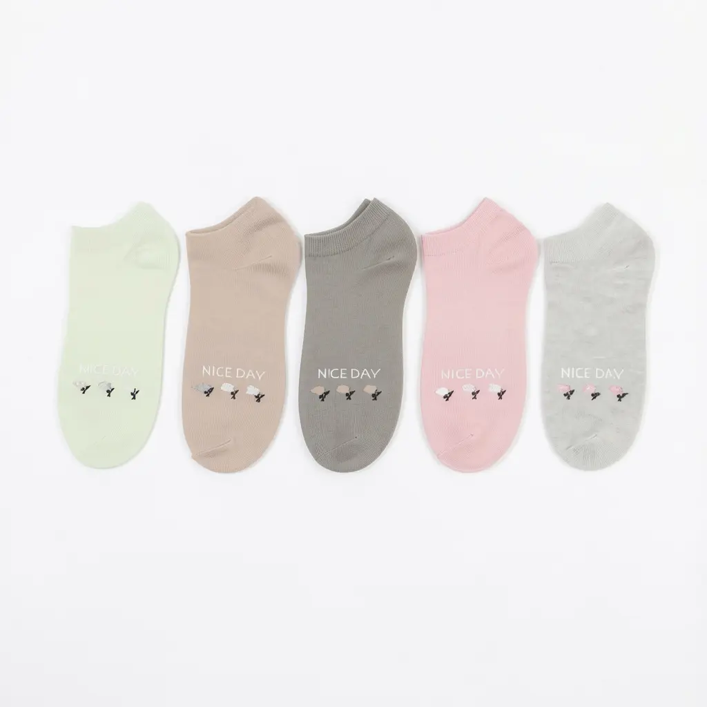 Start every step with a smile!  These adorable low-cut ankle socks feature the cheerful “NICE DAY” slogan paired with delicate embroidered mini flowers and tiny bird accents — pure kawaii charm in soft pastel shades (mint green, warm beige, cozy gray, blush pink, and light gray).